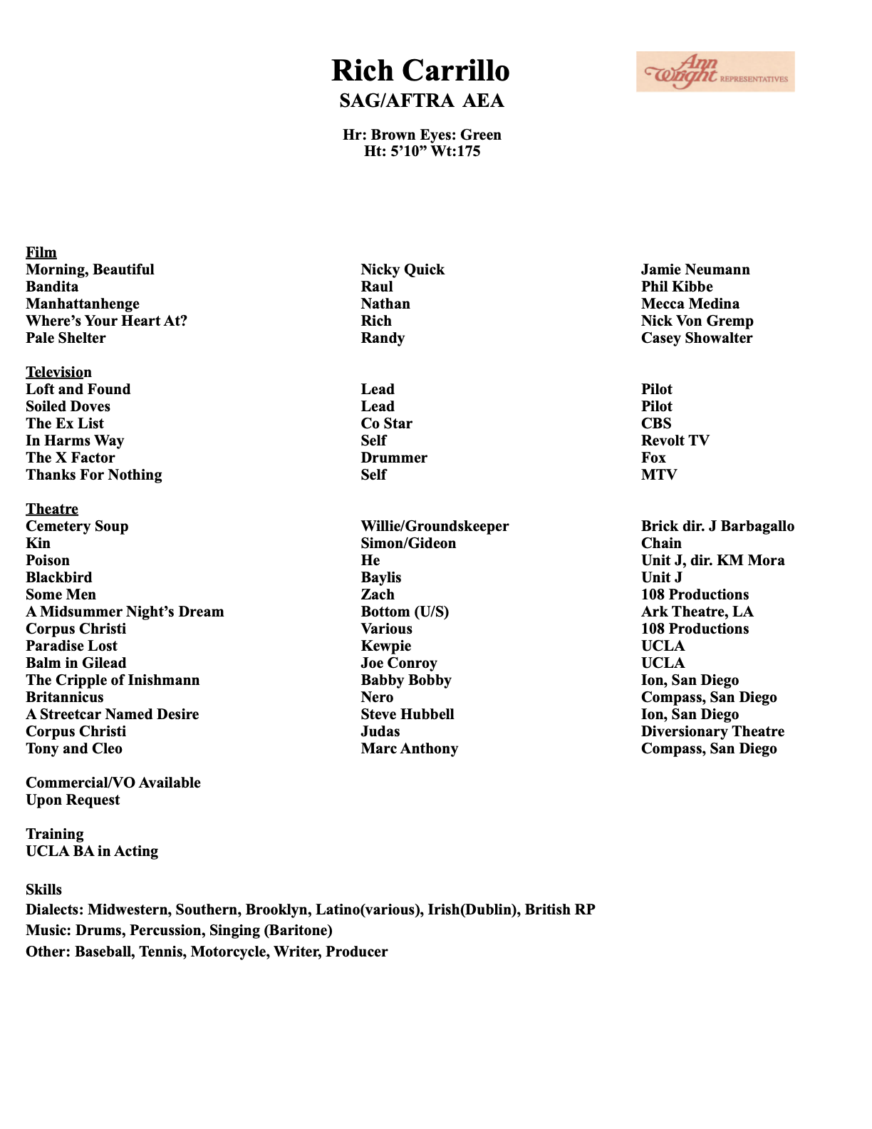 After finishing military service I attended UCLA's School of Theatre, Film, and Television where I completed my Bachelor's degree in Theatre with an emphasis in Acting.